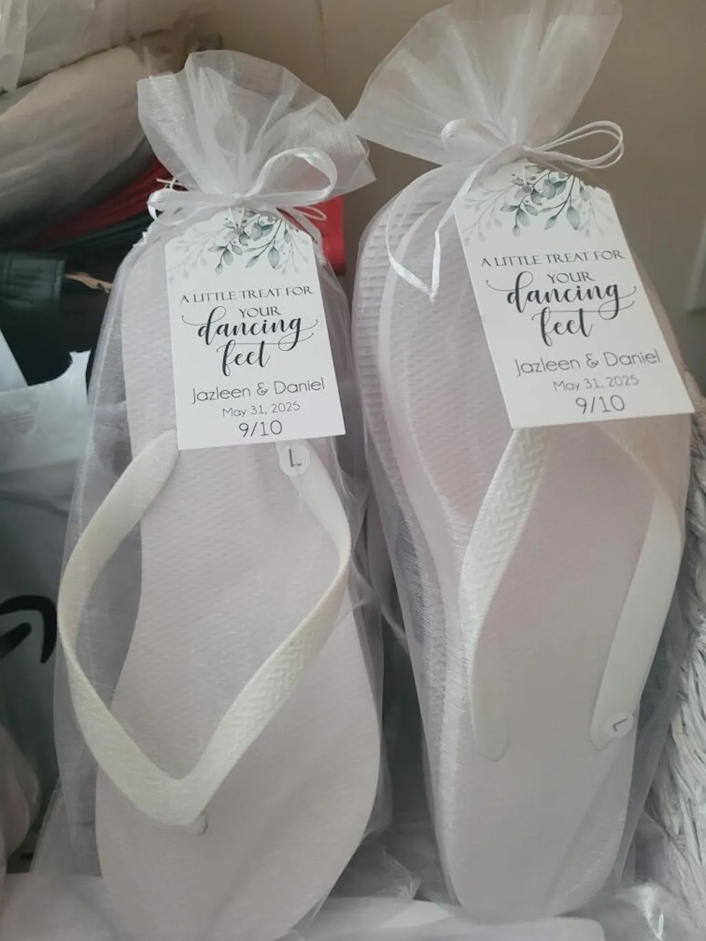 Our white wedding guest flip flops are a pure white color that is perfect for any themed wedding. The strap is a simple matte color that goes with pretty much anything.